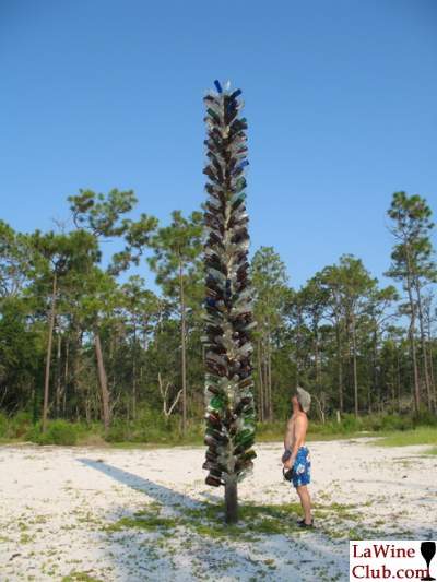 | That's right, a wine bottle tree. Essentially, take a big pole, hammer big nails into pole, then stand pole upright in properly-sized hole. Add wine bottles. (See the photo above...you can just see one of the nails inside a green bottle.)